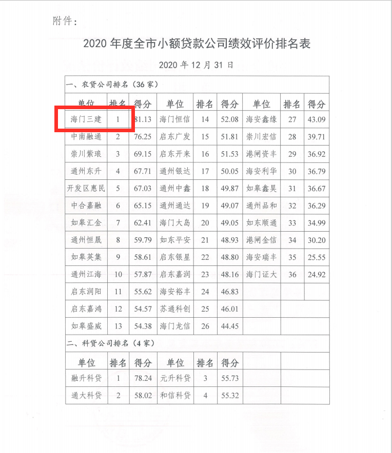 近日,南通市地方金融监督管理局通报2020年度全市小额贷款开云网页版绩效评价情况。三建农贷以81.13分位列全市36家农贷开云网页版第一位。